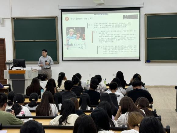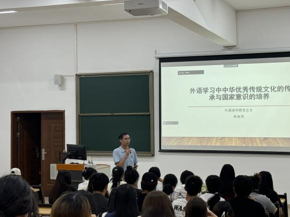 首先,冉书记以“外语学习中华优秀传统文化的传承与国家意识的培养”为主题,从党的二十届三中全会中的重要表述切入,引入外语讲述,贴合同学们所学的专业。随后,冉书记带领学子们了解时政常识、网络安全和文娱领域所反映的青年意识形态,与同学们一同思考学习语言的价值。此外,冉书记还从外语员工学习传承中华优秀传统文化的意义、外语员工的现状及外语员工应当培养国家意识三个方面,结合案例与经验为同学们讲述了作为新时代青年应如何讲好中国故事,说好红色故事,树立家国情怀,加强对家乡的认同,对身份的认同,对国家的认同,增强文化自信。最后,冉书记为同学们介绍了讲好当代中国故事的权威读本——《习近平谈治国理政》多语版,让同学们多了解学习,再传播中华文化,让中华优秀传统文化走出国门,走向世界!