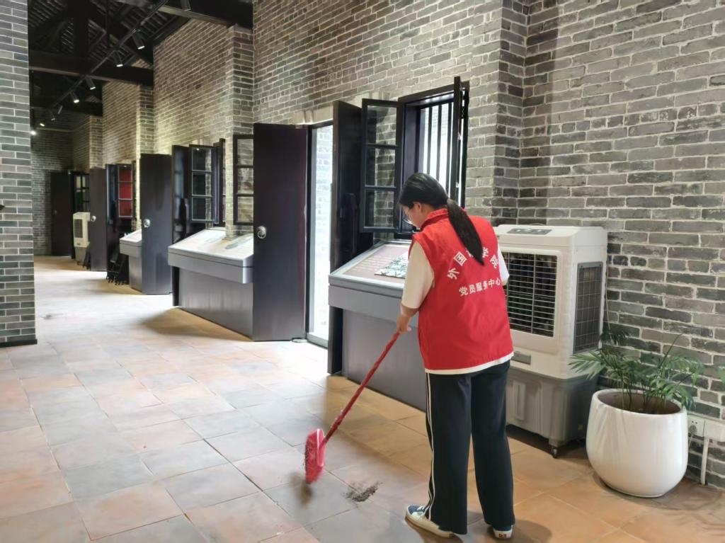 活动现场,志愿者们身穿红色志愿马甲,以饱满的热情有序投入工作。他们分工明确、配合默契:手持扫帚、抹布等清洁工具,对场馆内外进行全方位清扫——从地板缝隙、墙角等卫生死角,到场馆内的桌椅展柜,均进行细致擦拭与规整,以实际行动为游客打造干净、整洁、舒适的参观环境。此外,在游客信息登记处,志愿者们始终面带微笑,耐心引导每位游客完成登记手续,用贴心服务保障参观流程的顺畅与高效。