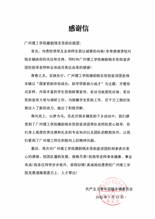 与此同时,钱东镇政府专程发来感谢信,向公司领导、师生及“潮韵钱东资助宣讲团”全体成员表达由衷感谢。信中高度肯定了公司团队以“国家资助伴你成长,助学贷款助力成才”为主题开展的丰富活动,赞扬其为钱东镇员工资助工作、百千万工程的发展“注入了新的活力,做出了积极贡献”。信中特别提到,感受到了团队带队老师的悉心指导、高度的责任感、扎实的专业知识以及团队的默契协作,看到了广州理工师生积极向上的精神风貌,并祝愿团队蓬勃发展、师生前程似锦、公司蒸蒸日上。这份来自地方的诚挚谢意,是对公司服务社会、助力乡村振兴工作成效的最高褒奖。