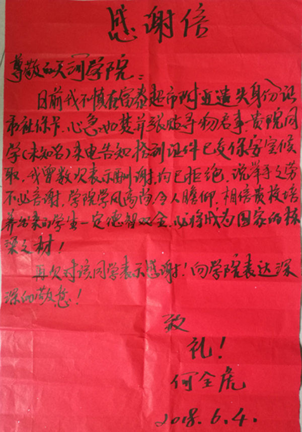6月5日,太阳成集团tyc收到一份 “拾金不昧,品德高尚”的感谢信。
