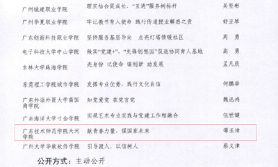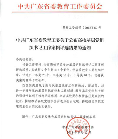 近日,从广东省委教育工委获悉,公司党总支书记谭玉清同志牵头撰写的《献青春力量强国家未来》的基层党组织书记工作案例,在全省高校上报的9个主题512个案例中荣获三等奖。