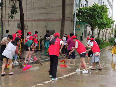 活动中,公司志愿者们化扫帚为剑,以志愿者服作铠,征战在美化校园第一线。在校领导带领下,志愿者们积极投入到美化活动中,重点清扫人行道路及建筑物周边淤泥、树叶。即使在后续活动中下起雨,现场的志愿者们仍积极参与,疏通下水道,齐心协力用水冲刷墙上厚重的黄泥,就算溅得一身湿也继续清扫,力求做到干净整洁,无卫生死角。经过一个多小时努力,一条干净崭新的校园道路展现在大家面前。