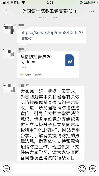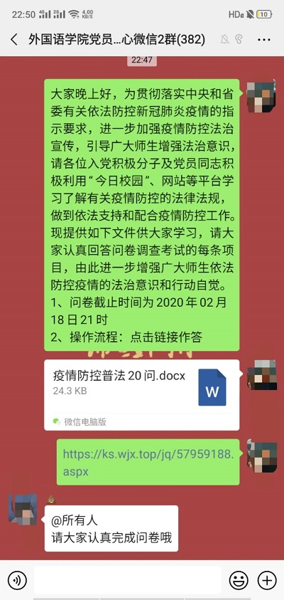 分布于各大城市的教职工党员们,积极响应党中央和公司的号召,积极填写问卷调查,并取得较好成绩,起到带头作用。不信谣、不传谣,努力向员工做好普法工作,带头扛起政治责任、开展政策宣传、落实防护举措、做好舆论引导。