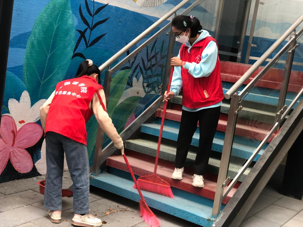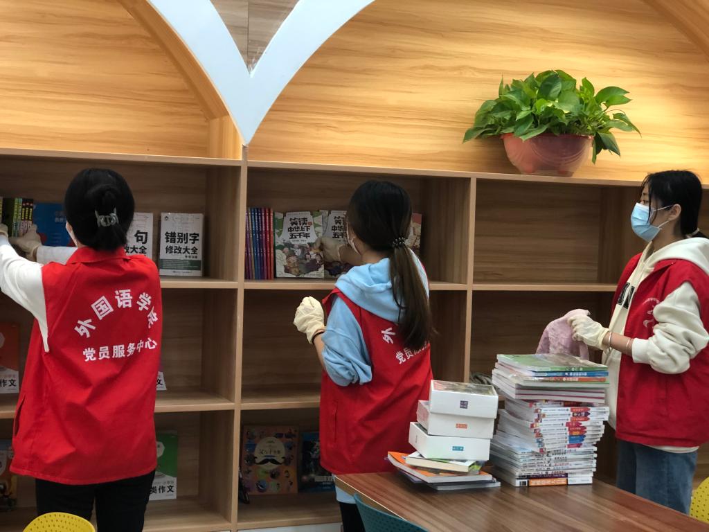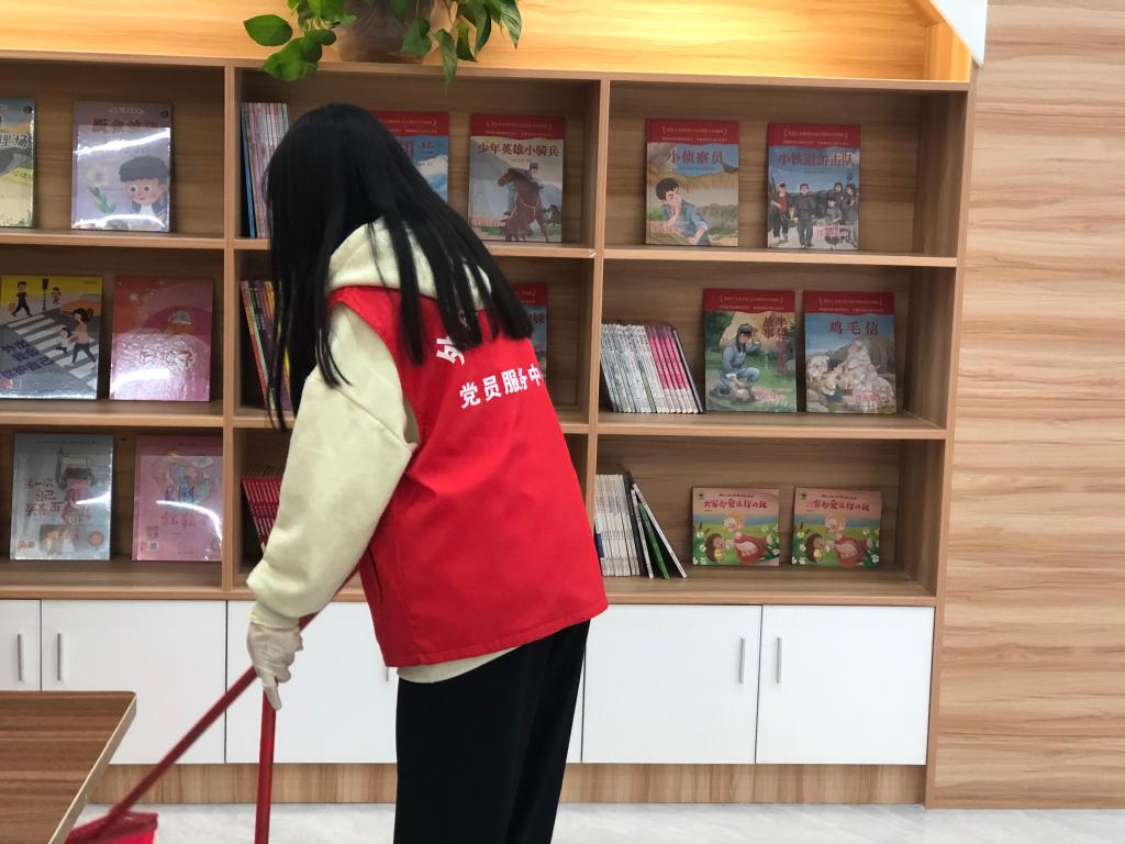 在图书管理员的带领下,身穿红马甲的志愿者们进行明确分工后便立即投入到各自的志愿服务中。此次志愿活动的主要内容有图书室的地面清洁、书架和桌子的擦拭、栏杆和绿植的清洁、书籍整理等。活动期间,志愿者们以积极的态度和饱满的热情投入到劳动中,使得清洁工作高效有序地完成,做到包干区内整齐洁净。
