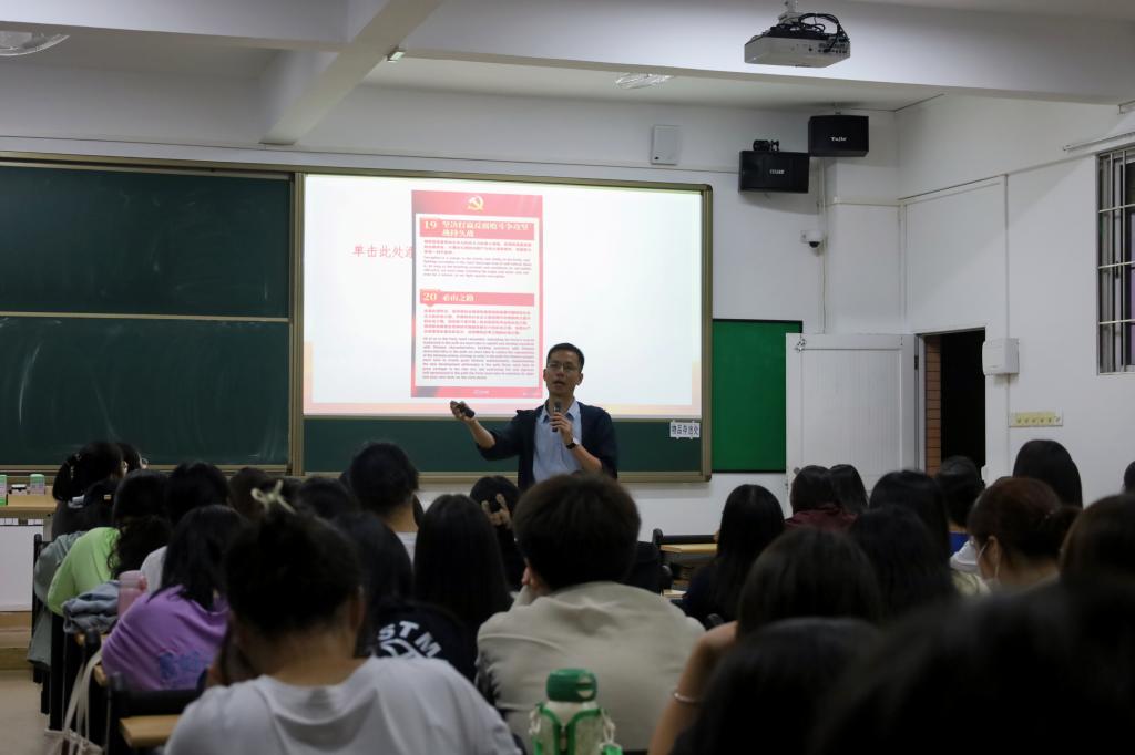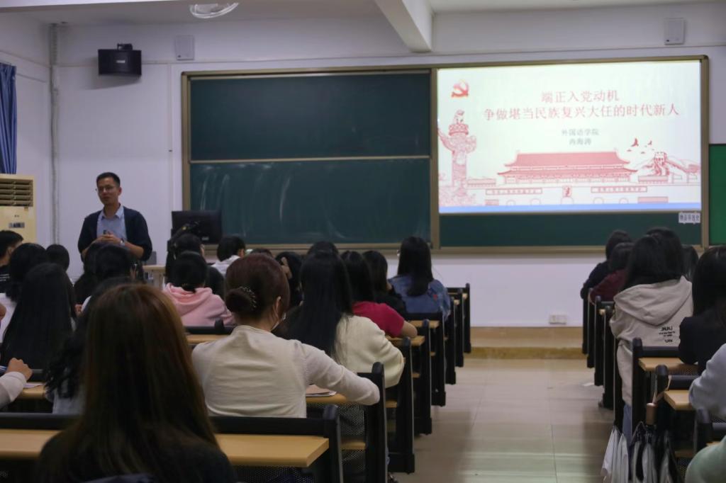 最后,冉海涛书记结合专业特点,以双语学习贯彻党的二十大精神作为思政教育核心抓手,分享党的二十大报告双语金句与热词。他希望入党积极分子能深入学习中外历史,了解中外文化的差异,吸收国外先进文化,传播中华优秀传统文化,充分利用专业优势,传播好中国声音,展示真实、立体、全面的中国。