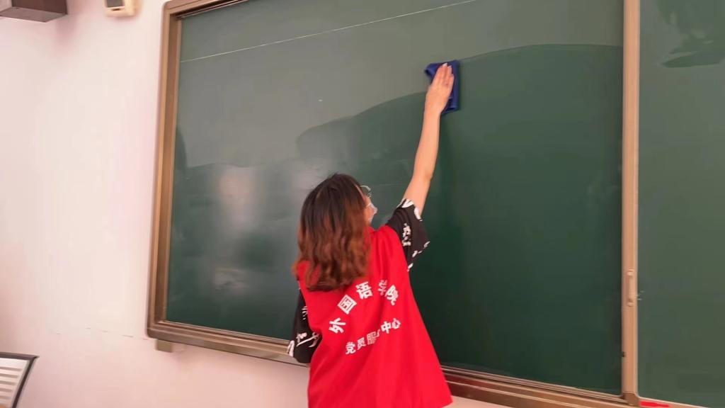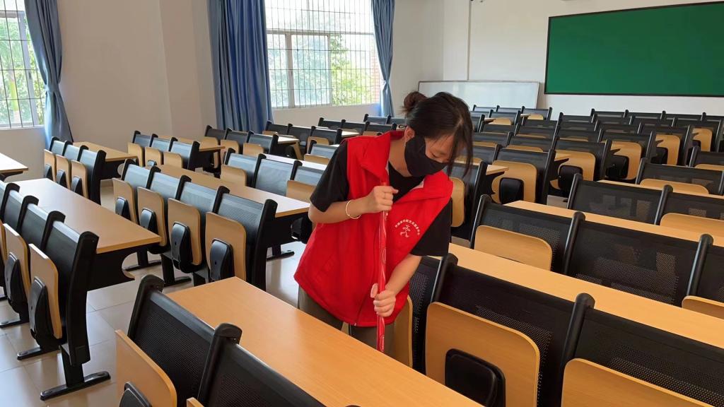 党员服务中心志愿者们分工明确,相互配合,认真清扫6栋和7栋部分教室的每个角落,认真清理地面上的纸屑和抽屉里的垃圾,仔细擦拭课桌上的灰尘和黑板上残留的板书,极力做到卫生清洁不留死角、不留盲区,展现了公司学子热爱劳动、昂扬向上的青春风采。