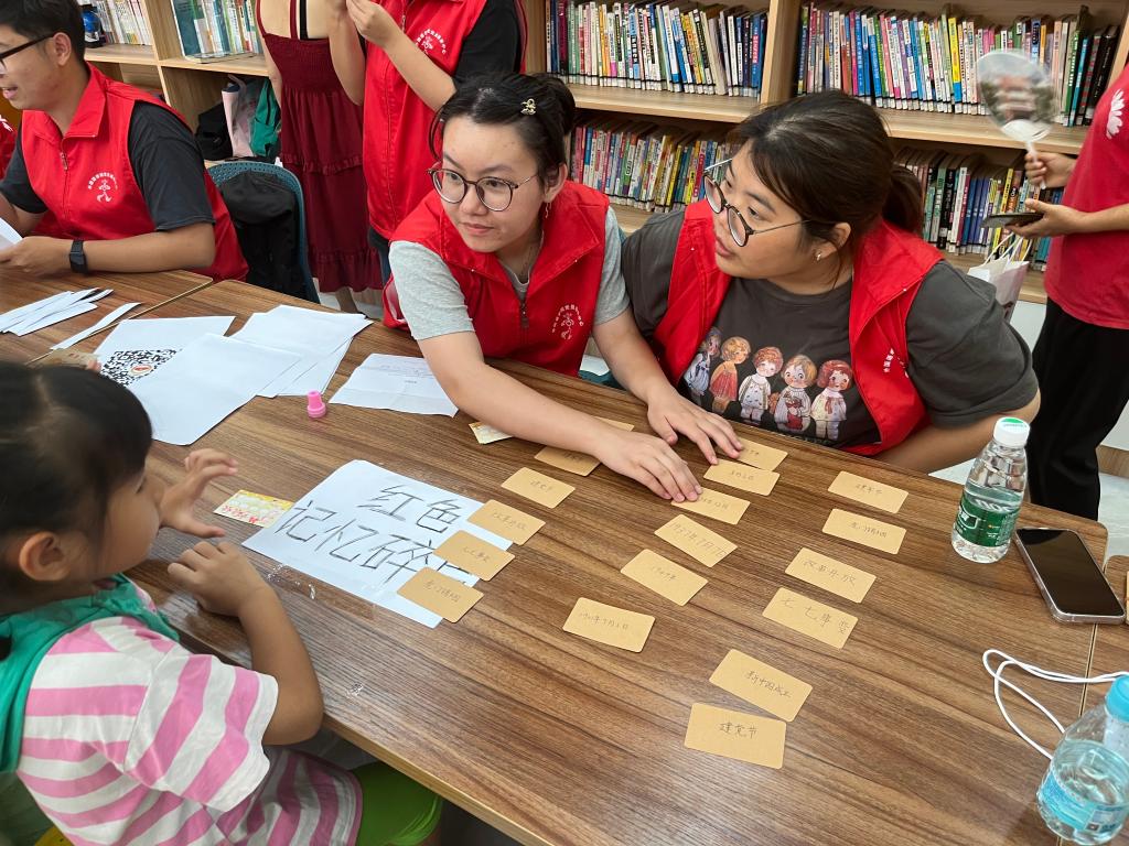 到达图书馆后,公司暑期社会实践团队成员明确各自的分工和责任,有条不紊地布置活动现场,整齐摆放好物资,布置好座椅板凳,等待家长及员工的到来。此次宣传活动采用线上线下相结合的方式,线上通过实时直播对外宣传,线上观看直播人数累计约1200人,现场到场人数约为200人。在宣传活动过程中,公司暑期社会实践团队成员热情地接待每一位家长和员工,耐心细致地解答家长们的问题,组织大家有序参与活动。活动游戏分时段进行,上半场为历史知识问答、你划我猜、雷区采水;下半场为看图猜成语、红色记忆碎片、红歌大合唱。红色文化宣传活动将历史知识融入游戏中,以任务、关卡等形式引导参与者进行探索和学习,增加趣味性和参与感,加深对历史事件的印象以及增进对优秀人物事迹的了解,同时引导家长和员工缅怀历史,悼念先烈,进一步增强爱国信念。最后大家通过合唱红歌的形式增强民族自信心与民族自豪感。