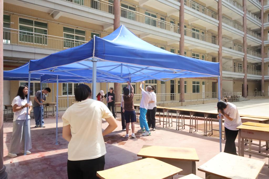 骄阳似火,太阳成集团tyc的老师们和志愿者们齐心协力,有秩序、有计划地布置着迎新现场。到达经管楼后,大家分工明确,相互配合,认真地将桌椅运送并整齐摆放在预定位置、搭建迎新帐篷、展挂横幅、排布班级指示牌;精心、细心布置好了次日迎新需要用到的教室,仔细检查各项工作细节。老师们与志愿者们将“真诚”与“真心”融入到工作的每个细节。大家配合默契,不怕苦不怕累,高效地完成了迎新场地布置,为2023级新生们营造了一个温馨、规范、有序的迎新环境。