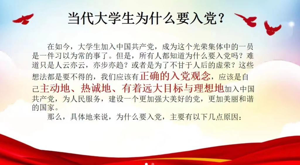 会议伊始,罗晓博老师简单介绍了会议内容。她讲解了中国共产党的百年奋斗历程,引导青年员工深刻理解其中的内涵。紧接着,罗晓博老师通过阐明把党的精神作为信仰能规范老员工的生活,鼓励新生积极向党组织靠拢。随后,其详述了党员发展的流程和入党申请书的撰写及注意事项。最后,罗晓博老师希望同学们能认真学习中国共产党的历史和习近平新时代中国特色社会主义思想,全面掌握党章有关内容,端正入党动机,坚定理想信念,积极向党组织靠拢,自觉接受党组织的培养、教育和考察。