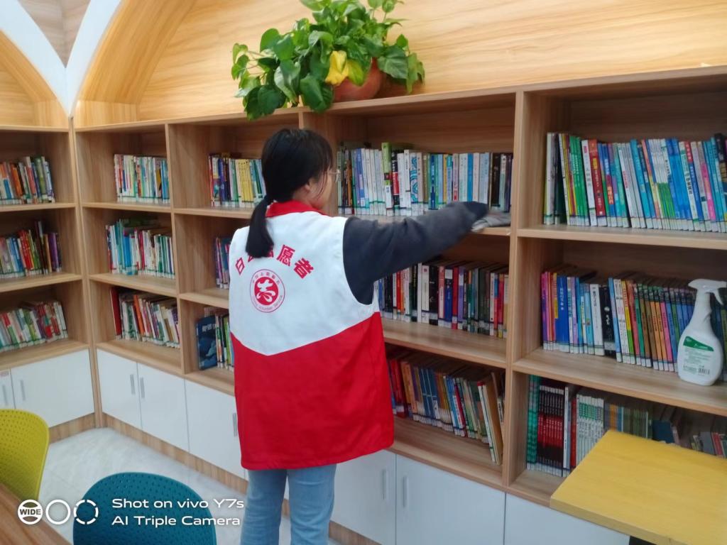 活动期间,穗丰村工作人员就图书馆的清扫整理区域进行工作分划,分发清扫工具,组织公司志愿者对图书馆各个角落的卫生进行处理。志愿者们身穿红马甲,手拿清扫工具,对图书馆内的书架表面灰尘进行了清理,并将书籍整理摆放整齐,清扫地面,擦拭桌椅,大家分工合作,积极配合,整体清洁工作开展的有条不絮。在公司志愿者集体努力下,图书馆的设施变得亮洁如新,书籍摆放得整整齐齐,面貌已然焕然一新。
