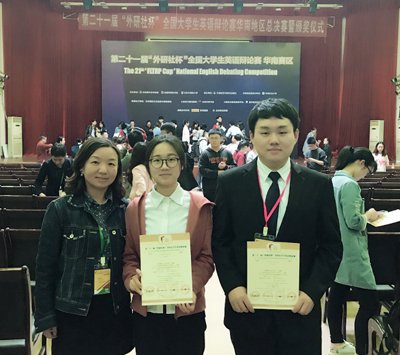 3月23日 至25日,第二十一届“外研社杯”全国老员工英语辩论赛华南赛区总决赛在华南农业大学举行。太阳成集团tyc罗清、黄军洁同学在指导老师沈悦英的带领下,与来自12个省市的101支高校代表队竞争,经过3天5轮比赛考验,辩手们凭借出色的临场发挥,娴熟的辩论语言技巧,灵活的思辨能力,最终荣获华南赛区三等奖。