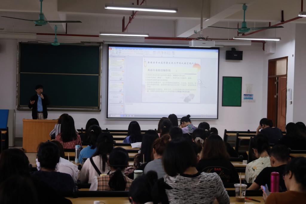 专题会议上,英语系副主任潘宏妍讲解了华南理工大学国际教育公司安然教授在第二届中国跨文化教育与国际传播能力建设高端论坛上的“关于中国高校员工跨文化能力的起点研究“内容,即结合时代背景,通过分析员工跨文化能力的现状以及多元文化课堂下员工们的跨文化适应的心理变化等因素。潘主任结合论坛内容分享,希望教师们积极帮助员工建构跨文化知识体系,培养跨文化技能,形成正确的跨文化态度,从而强化员工跨文化意识,进一步提高员工的跨文化素养和交际能力。随后,潘主任分享了上海外国语大学教授、博士生导师赵蓉晖教授的“基于新型全球化视域下的国际理解与胜任力培养”讲座内容。该分享结合全球化视角和中国日益走近世界舞台中央的时代背景,深入探究实现国际胜任的外语教学理念,同时以多学科视角对外语教育、学习等能力要求进行分析。潘主任呼吁在座全体教师能够以全方位的学科视角去看待和观察外语教师的知识发展、课堂行为、情感变化等,同时以科学和人文的视角去关注教师整个行业的发展和教师个体的成长。