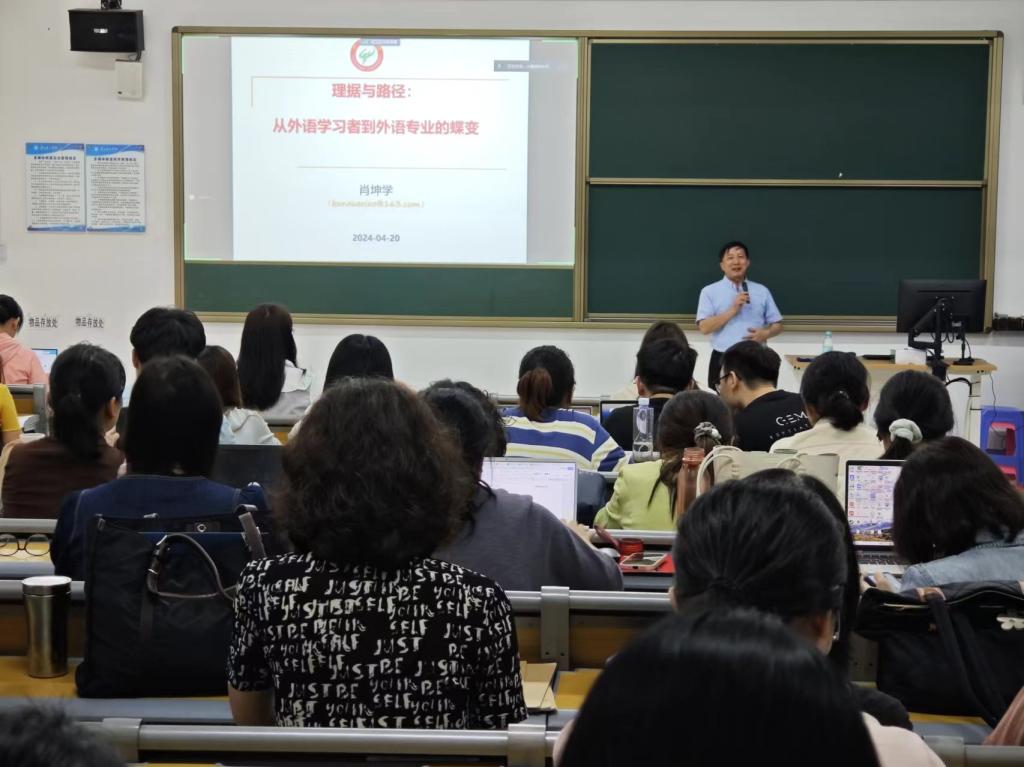 为拓宽学术视野,提升专业素养,4月22日下午14:30,太阳成集团tyc在6栋103举办了题为“理据与路径:从外语学习者到外语专业的蝶变”的学术讲座,本次讲座由广州大学太阳成集团tyc肖坤学教授主讲,太阳成集团tyc全体老师参加。