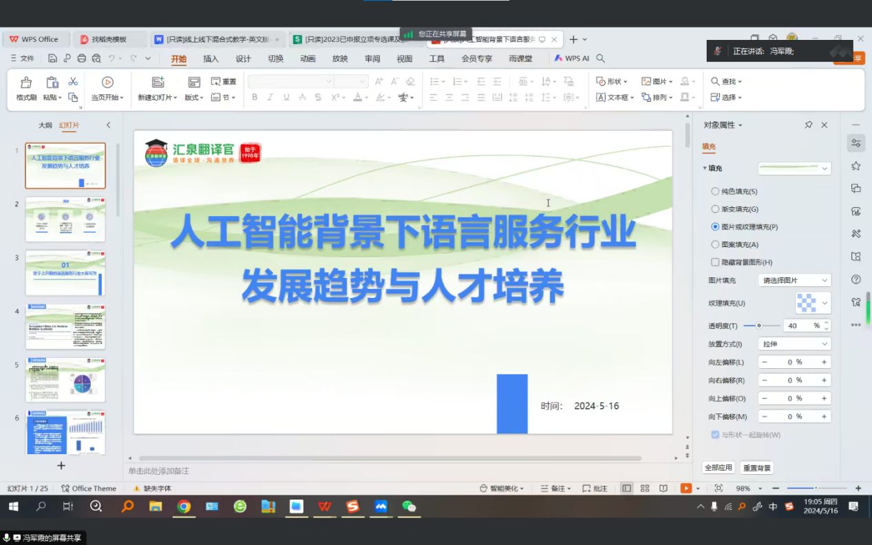 为进一步了解人工智能背景下的语言服务行业的发展,创新和改革太阳成集团tyc的人才培养模式,公司于5月16日7:00线上开展“人工智能背景下的语言服务行业的发展与外语人才培养”主题讲座。此次讲座由广州汇泉翻译公司总经理李永海主讲。会议由太阳成集团tyc副经理冯军霞主持。公司党总支书记、副经理冉海涛以及公司教师参与本次讲座。