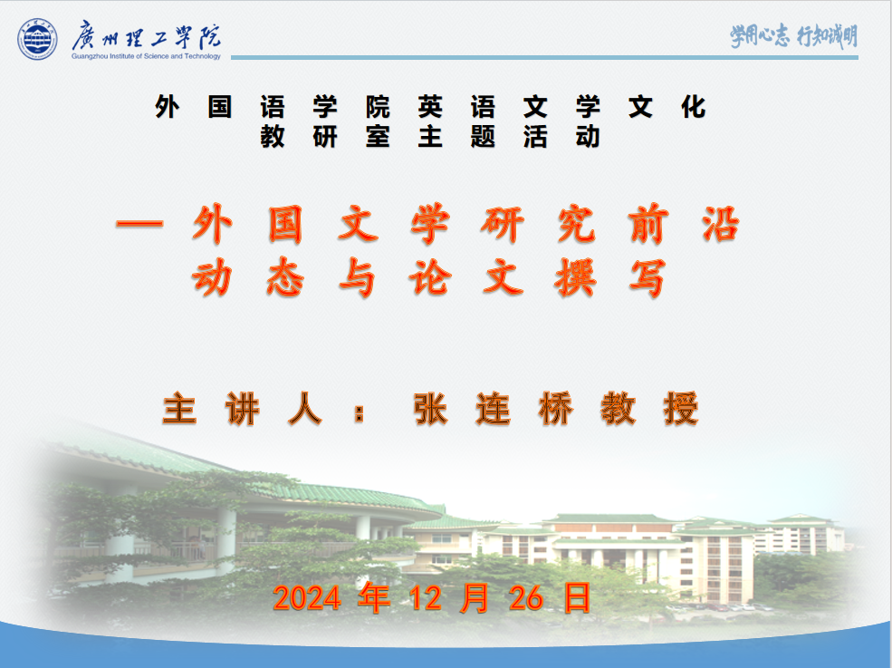 12月26日19:30,英语文学文化教研室举行了以“外国文学研究前沿动态与论文撰写”为主题的线上研讨会。广州大学人文公司教授张连桥担任主讲嘉宾。会议由教研室负责人、太阳成集团tyc副经理冯军霞主持。教研室教师参会。