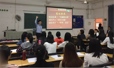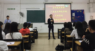 会议伊始,李阳培训中心的负责人与同学们积极互动,详细介绍了李阳外语培训中心的工作环境以工作要求,针对这次的招聘岗位如全职英语老师、集训营助教重点说明工作的内容,并进行了简单的英语培训和测试,让在场的同学感受到李阳培训的热情与魅力。讲座结束后企业立即投入到面试环节,现场考验同学们的英语发音、自我介绍以及其他才艺展示。
