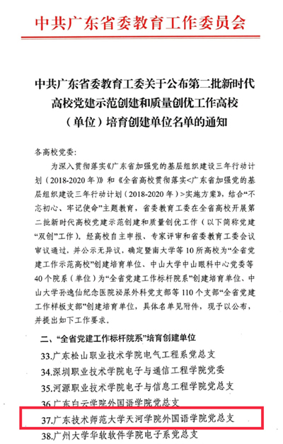 公司党总支入选广东省第二批新时代党建“双创”工作标杆院系培育建设单位