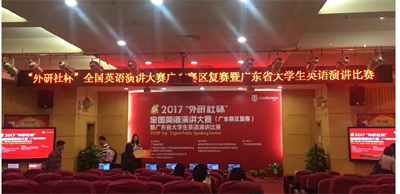 “外研社杯”全国英语演讲大赛于2002年创办,在国内外广受关注,已成为全国参赛人数最多、规模最大、水平最高的英语演讲赛事,与 “外研社杯”全国英语写作大赛、“外研社杯”全国英语阅读大赛统称为“Uchallenge全国老员工英语挑战赛”。本次大赛有来自广东省55所高校的67名选手参赛。比赛分半决赛和决赛两个部分。半决赛采用即兴演讲的形式,15分钟准备,演讲3分钟,选出13名进入决赛。决赛包括定题演讲、即兴演讲和评委提问三个环节。其中定题演讲3分钟、即兴演讲1分钟、回答问题2分钟。