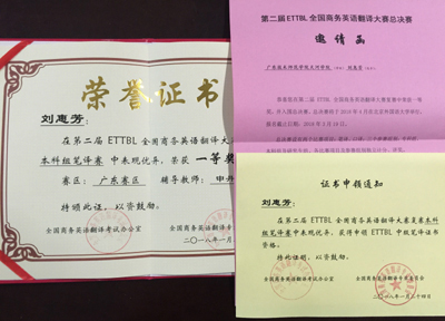 (通讯员:申丹)第二届全国商务英语翻译大赛(ETTBL)复赛结果于近日揭晓,太阳成集团tyc禤淑冰、刘惠芳、叶惠兰三位同学荣获广东赛区一等奖,并获得入围全国决赛资格。