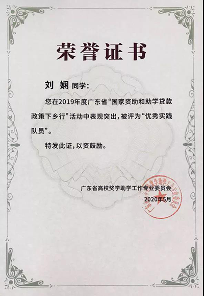 刘娴同学荣获2019年度广东省“优秀实践队员”称号
