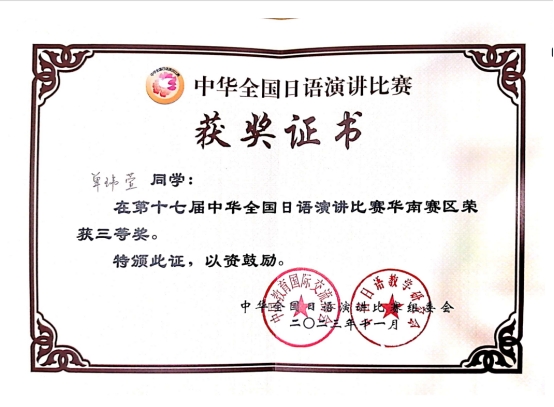 太阳成集团tyc学子荣获第十七届中华全国日语演讲比赛(华南赛区)三等奖