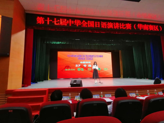 中华全国日语演讲比赛汇集了全国各高校日语专业的优秀选手,不但级别高而且难度大,是我国日语教育领域最具影响力的权威赛事。经教育部批准,自2006年以来,已成功举办了十六届。单玮萱同学在指导老师江小娟副教授为期6个月的辅导下,反复练习,精心打磨,顺利通过预赛,得以与广东外语外贸大学、广西师范大学、海南师范大学、中山大学、华南理工大学、福建师范大学、华南师范大学、厦门大学等高校的30名选手一起入围华南赛区决赛。决赛分为“命题演讲”和“即兴演讲”两部分,单玮萱同学凭借平日里的苦练和扎实的日语实力,做到了情感充沛、用语自然,顺利完成了两个环节的演讲,赢得了评委老师和现场观众的普遍认可,充分展示了公司学子出色的精神风貌和教师良好的专业教学水准。