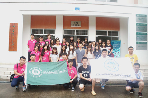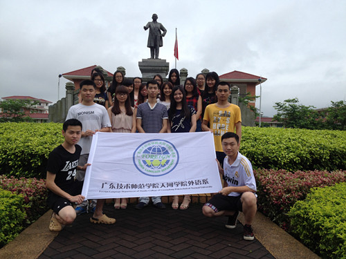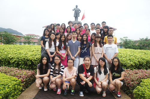 陶嘉毅主席一行在外文系团总支员工副书记李珏、员工会主席陈晓萍等团学干部的带领下参观了南方公司校园,并在孙中山塑像前合影。