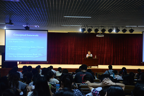 在一个多小时的讲座中,欧阳教授用幽默风趣的语言,精炼清晰的PPT,首先具体演示一系列典型的中国员工在英语写作中的盲点难点,然后结合中西社会在交际目的和功能、论证述求原则、以及语言表达和修辞的风格方面的传统,重点分析其背后的社会实践共同体的差异。让所有的师生们对中英写作中涉及的深层原因有新的认识。