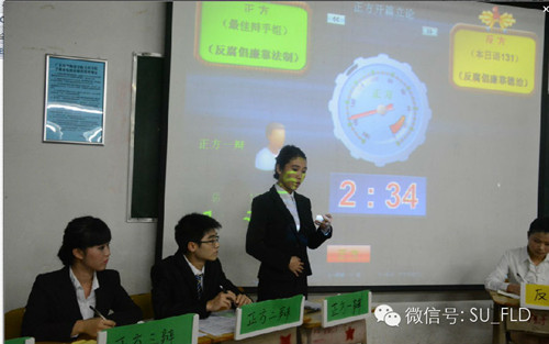 首先,正反双方一辩就辩题做出阐释。正方认为法制对防腐倡廉这一工作有举足轻重的作用,而反方则认为反腐要以德为主,以法为辅。在立论方面正方稍占上风。接下来,正反方二、三辩选择对方二、三辩进行一对一攻辩,双方你来我往,针尖对麦芒,反方二三辩在坚持自己立场,保卫自己观点方面做得尤其出色。紧接着,正反双方一辩就攻辩进行小结,正方指出对方辩友在言辞上夸大了道德作用,与实际不相符,而反方则认为对方过分强调体制改革而忽视了道德的作用。而在自由辩论,正方抓住每个人心中都有一个道德标准,各不相同,这时就需要法律的强制力来约束,这一重要论据加以发问和回答,反方针对法律具有滞后性,并加强对道德为主导,法制为辅助这一立场进行激烈辩论,最后精彩的自由辩论结束,双方四辩作最后的总结陈词,反方再次重申道德和法制之间,道德对防腐倡廉的作用更加重要,因为法制具有滞后性,而更应该坚持以法制为辅,德治为主的反腐倡廉,构建和谐社会。正方在总结陈词时,先针对反方在全场出现的失误进行针砭,从每个人心中都有一个不用的道德标准,这时要靠法制的强制力,律人律己,这样才能更好的做好防腐倡廉的工作,让社会风气转向清正廉洁,构建和谐社会,正方四辩刚强有力,临危不惧,成功力挽狂澜,让整场比赛进入白热化,胜负未可知。