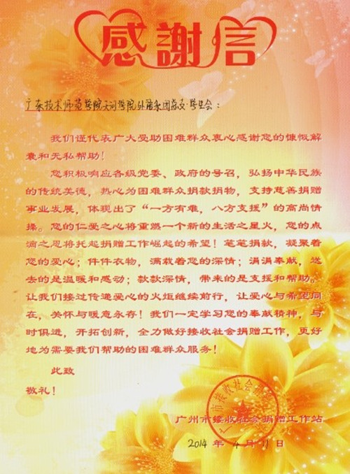 站点工作人员为我们开具了接受物资凭证,并由外语系团总支·员工会代表所有大力支持和热心参与活动的公司师生们接收了感谢信。