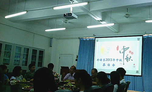 茶话会由党总支书记谭玉清主持,他首先代表系部向这些远离家乡,远离父母的新生们及他们的父母和亲友致以节日的慰问和美好的祝福。朱甫道主任代表外国系欢迎新生的加入,与大家一起畅谈梦想。朱主任在讲话中提到了新生应通过军训苦其心志,增强体能,才能增益其所不能。新生们纷纷谈论自己初到大学的感受,介绍各自家乡的特产、名胜古迹以及风土人情。新鲜欲滴的果盘、温馨的话语、美味的月饼,欢快的音乐,现场一片温馨的节日气氛。情歌对唱《小酒窝》、《我的未来不是梦》更是得到大家的阵阵掌声。在活动结束时,谭书记希望大家把节日的问候带给家人和朋友,祝愿新生们度过美好的老员工活。