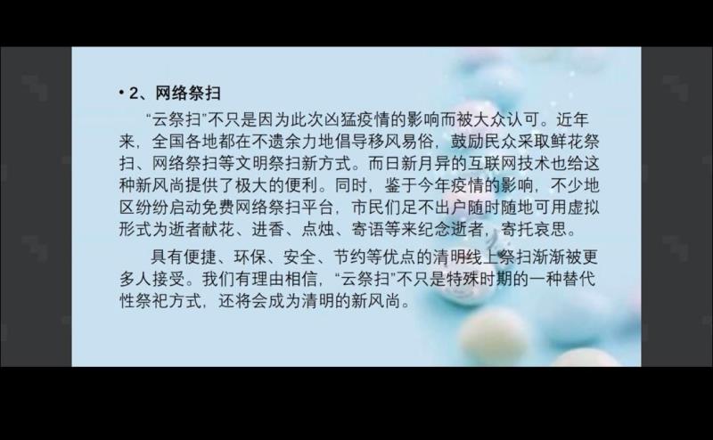 此次班会辅导员号召同学们“云祭扫”尽量居家追思、文明祭扫,不扎堆、不聚集,遵纪守法,文明上网,不造谣、不信谣、不传谣,自觉抵制网络不良信息,没有接到通知的师生禁止返校。