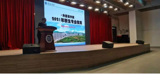 日语专业的黄国山老师用日语向同学问好,分析日语在当今社会的热度,并勉励他们坚信自己的选择,扎扎实实学知识、实实在在学做人。