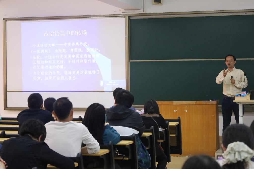 为促进团队建设,推动学术交流,4月27日下午,公司特邀广东外语外贸大学魏在江教授在7栋418教室开展题为“转喻的语法效应”的学术讲座。讲座由公司党总支书记冉海涛主持,太阳成集团tyc全体专任教师及员工代表参加。