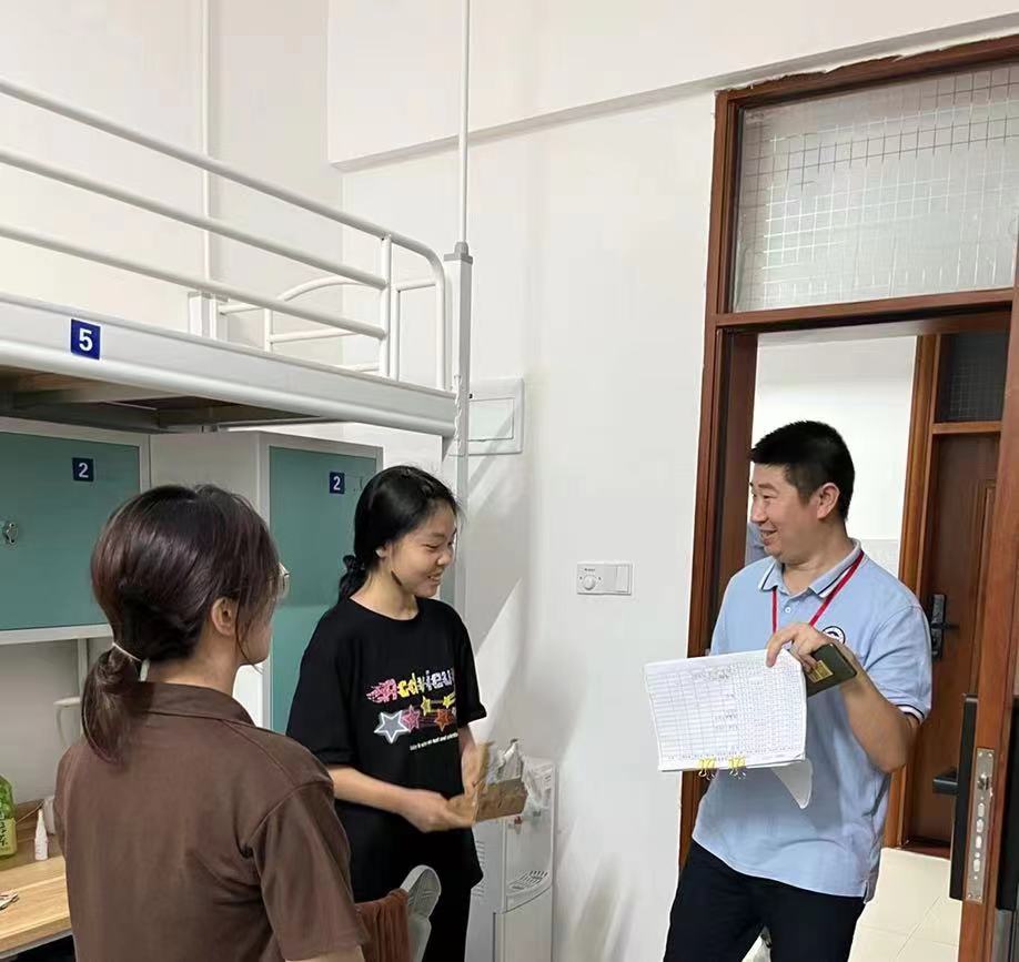 2023年9月9日晚,迎新工作结束后,公司党总支副书记蔡俊带领2023级本科生辅导员常智超和王家佳走访惠州新生宿舍,与同学们亲切交谈。
