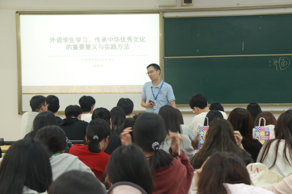 最后,韩经理强调,外语人才是传播和弘扬中国文化的重要力量,培养跨文化交际能力对促进文明交流互鉴至关重要,并呼吁同学们积极提升语言能力,增强文化阐释能力,努力成为沟通中国与世界的桥梁。