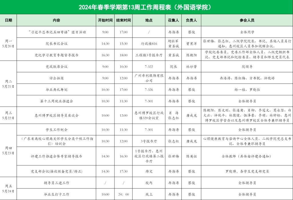 2024年春季学期第13周工作周程表