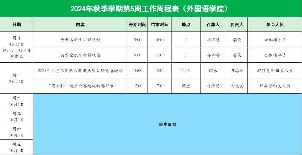 2024年秋季学期第5周工作周程表