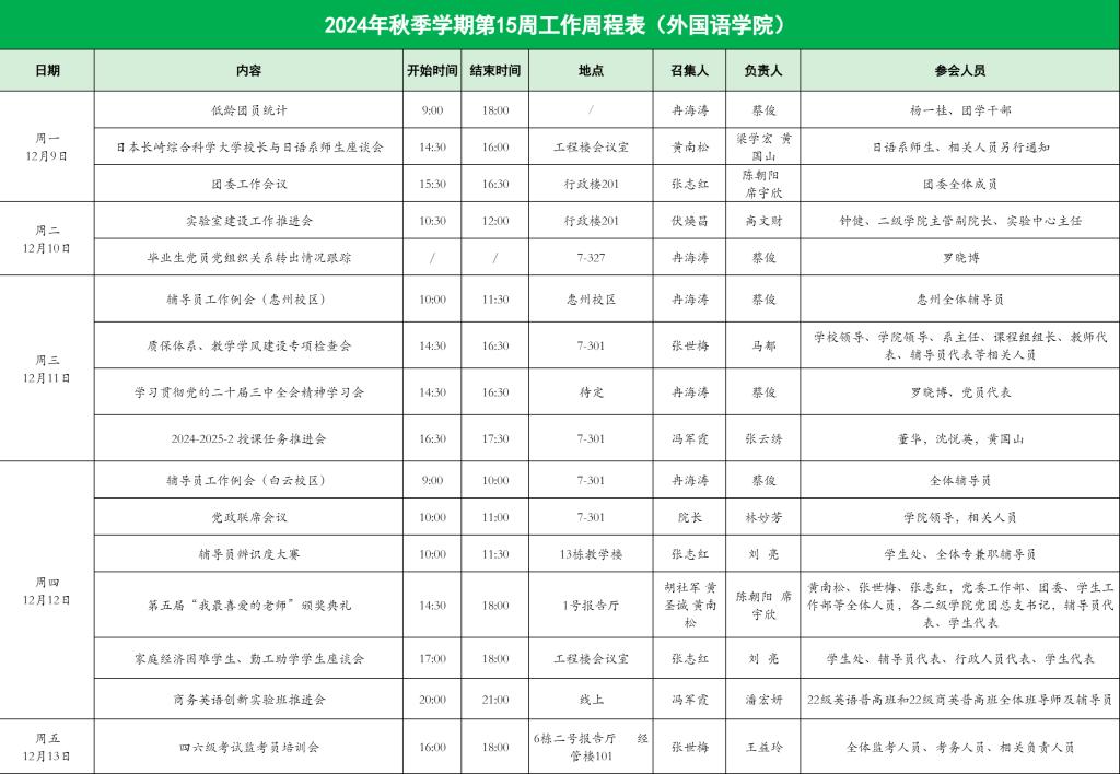 2024年秋季学期第15周工作周程表