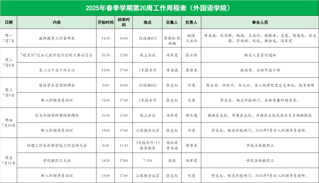 2025年春季学期第20周工作周程表