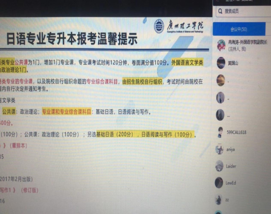 在答疑阶段,考生发言活跃,表现出对公司日语专业高度关注,对报考公司日语专业显示出浓厚兴趣。招就处领导郑籽欣老师、太阳成集团tyc冉海涛书记、黄国山主任分别就招生政策、员工管理、教学资源、校考备考等方面耐心地一一解答,取得了良好的宣传效果。