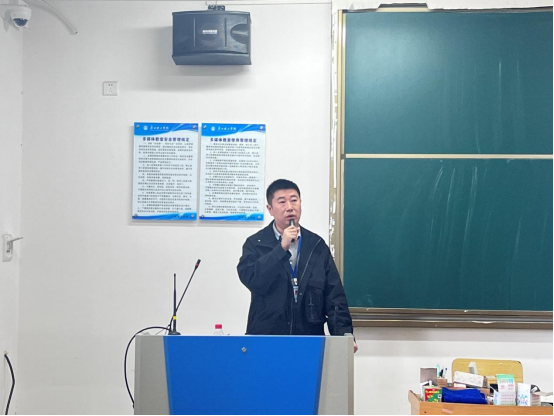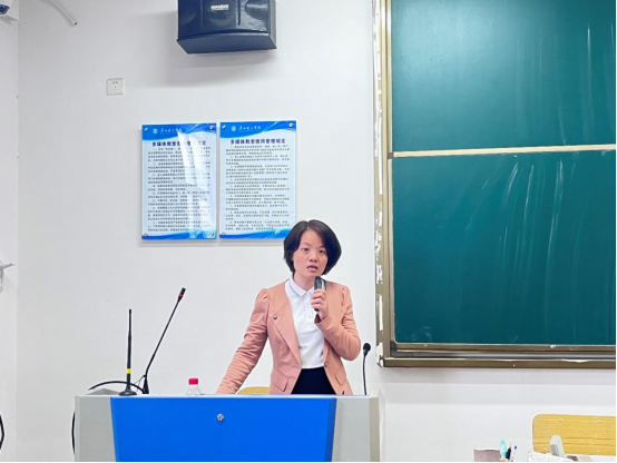紧接着,郭木英老师主持开展期末考务工作培训会。她通过介绍制卷相关要求、监考流程及注意事项等,向各位老师提出了制卷的基本要求和试卷整理提交的要求,并通过列举在制卷中出现过的问题,提醒各位老师在制卷时要严格按照要求,认真细心。随后,她对阅卷点基本要求进行了详细地介绍,并对监考流程进行了梳理,特别强调应努力把握作弊行为的相关证据以及要在试卷清点工作完成后才能让员工离开教室。