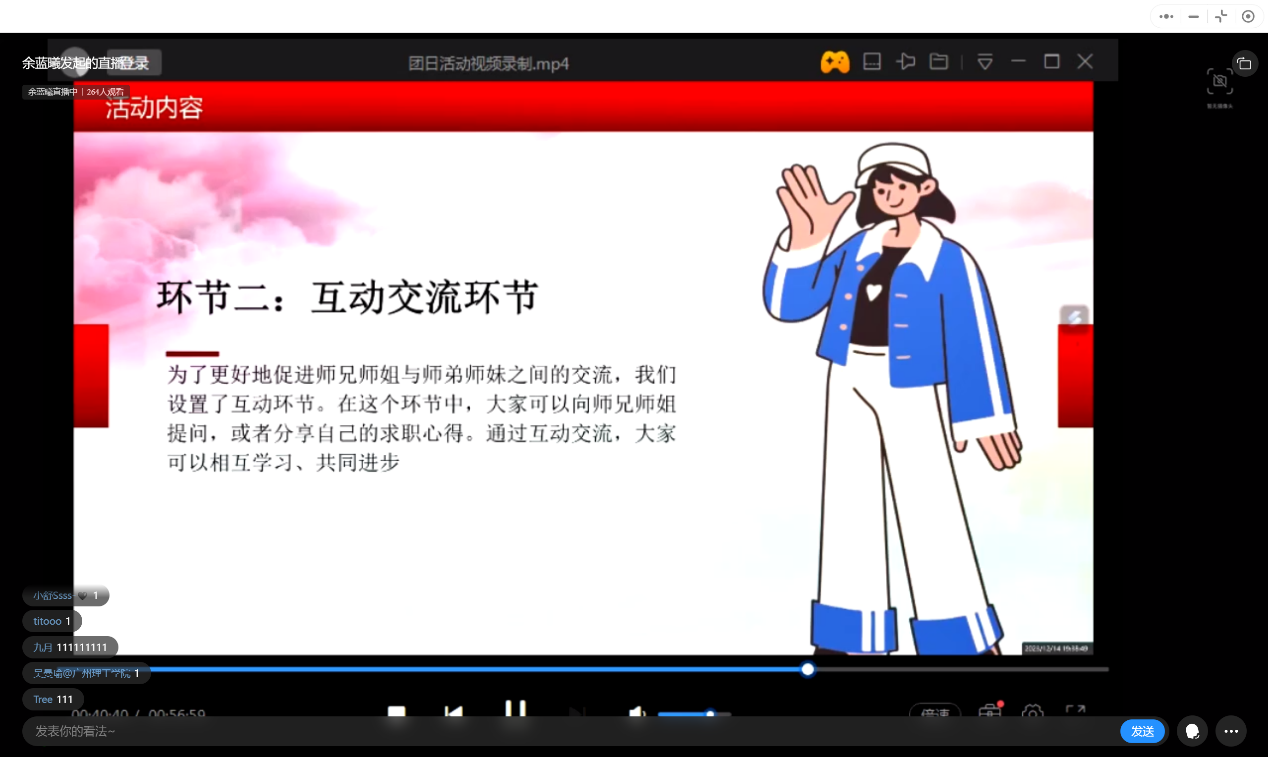 最后,余蓝曦老师为本次会议进行总结。她首先对各位毕业生表达了感谢与祝愿。随后,她希望同学们能在本次会议中学习相关经验,鼓励同学们大胆地探索自己的求职路,在未来实现职业理想。